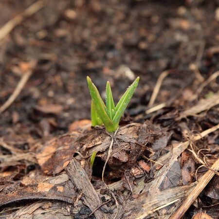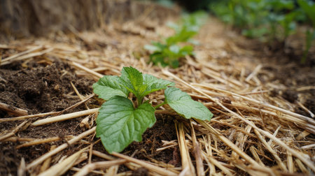A vibrant green plant emerges from the rich soil, surrounded by straw mulch in a natural outdoor setting, showcasing the beauty of growth and sustainable agriculture.
