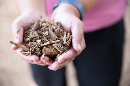 Brown wood chip mulch. Texture background. Horticulture and greenery
