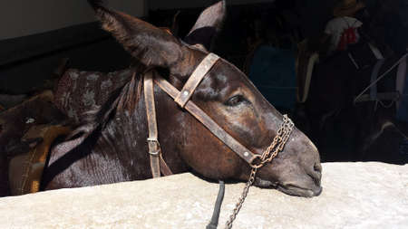 Traditional tourist attraction. Donkey of Santorini waiting for work