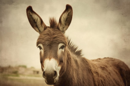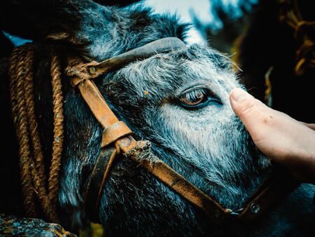 Donkey on a farm. Donkey nose close up. Toned soft focus.