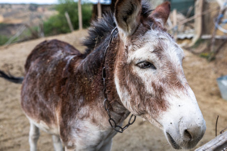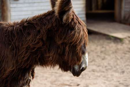 Donkey in the farm, close-up, selective focus.