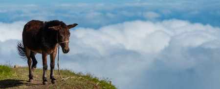 Closeup Donkey standing sideways on mountain above the clouds of cape verde island off the coast of africa