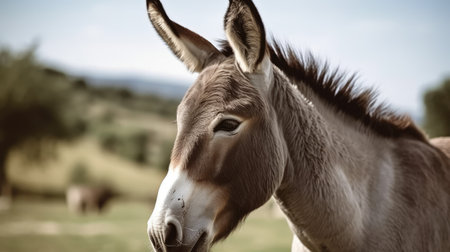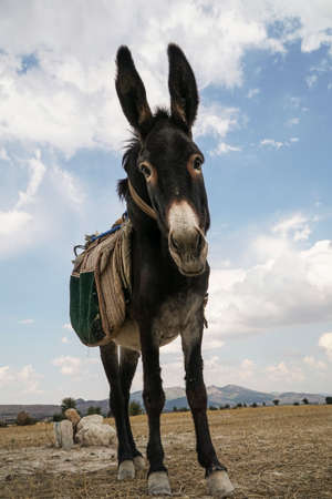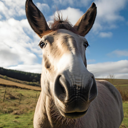 a funny donkey looking to the camera in the countryside