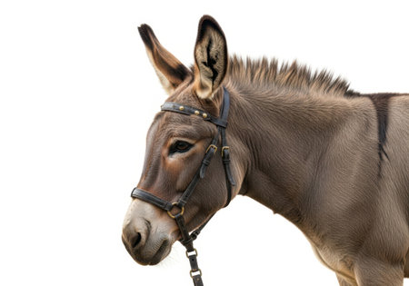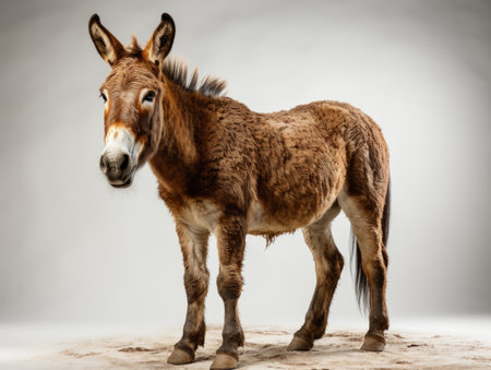 Cute donkey standing and looking forward, isolated on a white background, perfect for animal-themed visuals.
