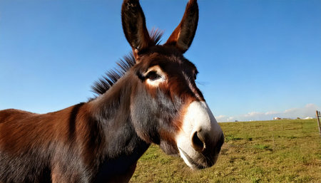 Close up of a donkey on a meadow with blue sky background