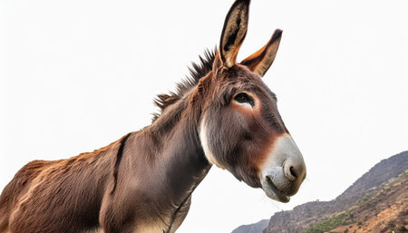 Portrait of a donkey on a white background in the desert.