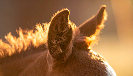 As the sun rises, its golden rays catch the delicate hairs on a horses ears, creating a warm, glowing halo. This peaceful, close-up moment captures the quiet beauty and gentle nature of a new day on the farm.