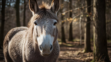 A captivating close-up of a curious donkey looking directly at the camera while standing on a forest pathway. The serene atmosphere and natural elements enhance the charm of this engaging animal portrait.