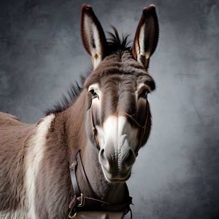 Portrait of a brown donkey standing on a gray studio background.