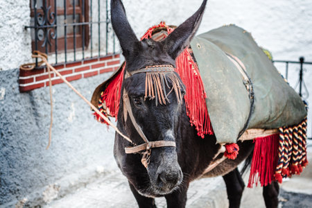A donkey on a farm, a beautiful photo of a donkey living on the street in a village. Contact zoo, farm.