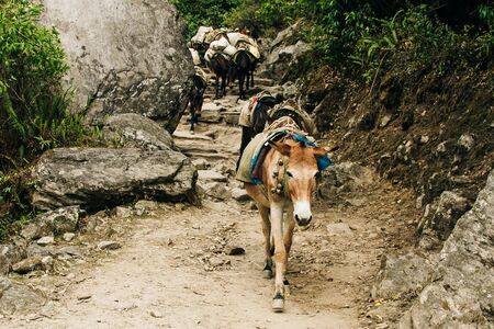 Portrait of donkey with heavy load at Everest Base Camp trek in Sagarmatha region, Nepal ,Asia