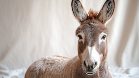 Donkey with a gentle gaze, looking directly at the camera, white backdrop, soft lighting, emotional connection, ultra-high-definition details