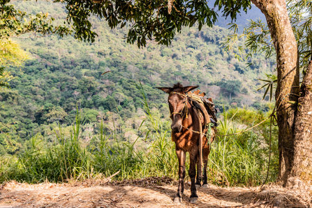 donkey laden with a load against the backdrop of beautiful naturel in Himalayas.
