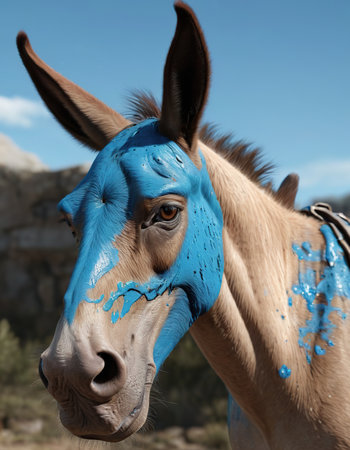 Portrait of a donkey with blue paint on his face in the desert