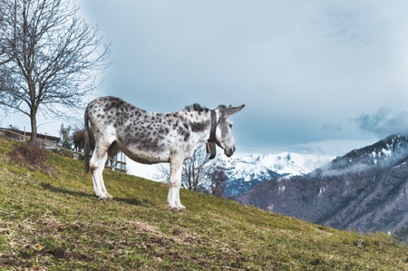 A spotted white mule in the meadow in the mountains In the Italian Alps