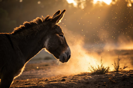 A donkey stands in a dusty pasture as the sun sets, creating a dramatic silhouette. Dust particles dance in the warm golden light, highlighting the animals features against the rustic backdrop.