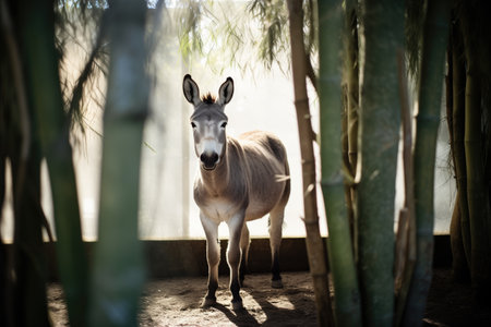 grey donkey standing in trees shadow