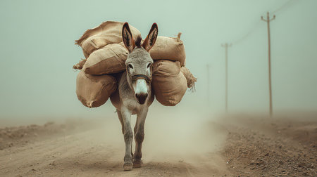 A donkey walks along a dusty rural path, carrying heavy bags in a foggy environment. This image captures the essence of hard work and transportation in rural life.