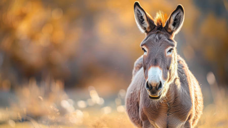 Donkey facing camera with warm, blurry autumn backdrop