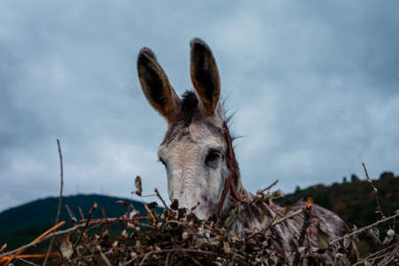 A portrait of a cute donkey hiding the face behind a pile of twigs