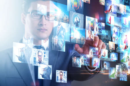 Businessman using smartphone and virtual screen, Social media concept.