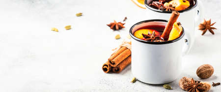 Mulled wine in white metal mugs with cinnamon, spices and orange on gray background, traditional drink on winter holiday. Copy space