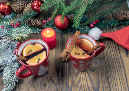 Cinnamon mulled wine in two red cups. Waiting for Christmas, view from the top