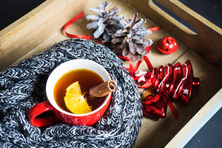 Red cup of teaa with lemon, Christmas lights and decoration on rustic background with copyspace