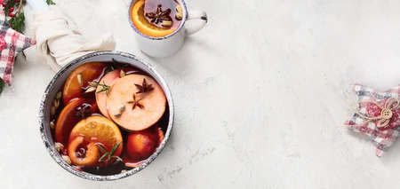 Traditional winter drink mulled wine and Christmas decorations on white rustic background