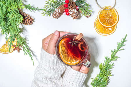 A top-down view of hands in a white sweater holding a mug of warm mulled wine, surrounded by Christmas decorations like fir branches, dried oranges, cinnamon sticks, and star anise on a dark background.