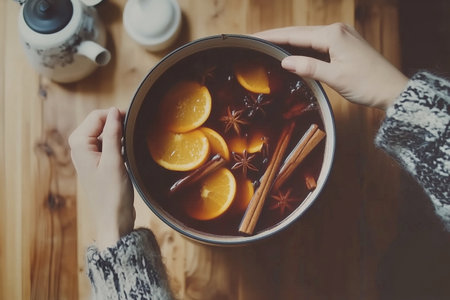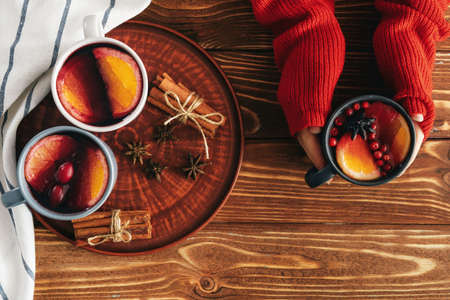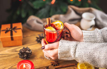 Woman's hands in a warm sweater are holding a cup of aromatic hot mulled wine on a wooden table. Concept of a festive atmosphere and cozy winter mood.