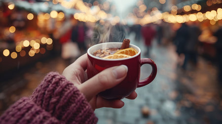 Festive holiday market with hands holding a steaming cup of mulled wine