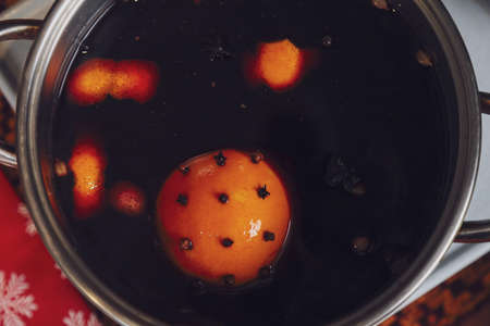 Mulled wine in the cooking process with ingredients in a saucepan. Background