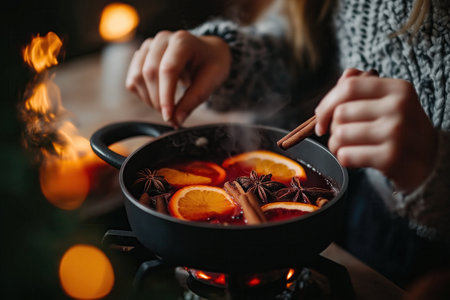 A woman's hands prepare mulled wine with orange, cinnamon, and spices in a pot, top view.