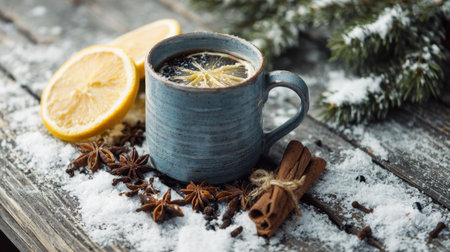 A comforting mug filled with a warm beverage sits on a snowy wooden table, accompanied by lemon slices and cinnamon sticks, perfect for winter.