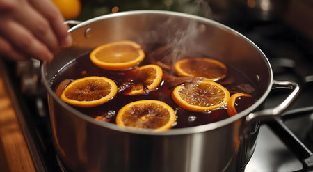 A pot of simmering mulled wine with orange slices, warm and inviting for the holidays.