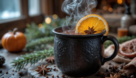 A warm mug of hot beverage with steamed cinnamon sticks and dried orange slices creates a cozy ambiance, perfect for winter days.