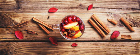 Hot mulled wine drink with lemon, apple, cinnamon, anise and other spices in a glass cup between fir tree branches on wooden cutting board. Copy space