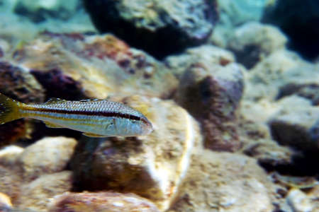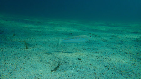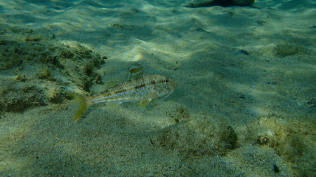 Striped red mullet or surmullet (Mullus surmuletus) undersea, Aegean Sea, Greece, Halkidiki