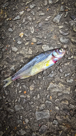 Detailed view of a fish lying on dark asphalt, showcasing its scales and a textured road highlighting contrast. Ideal for concepts like nature, urban, impact, and aquatic themes.