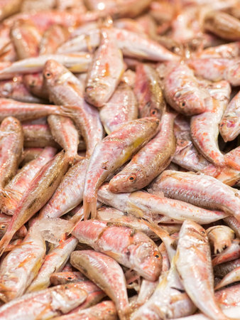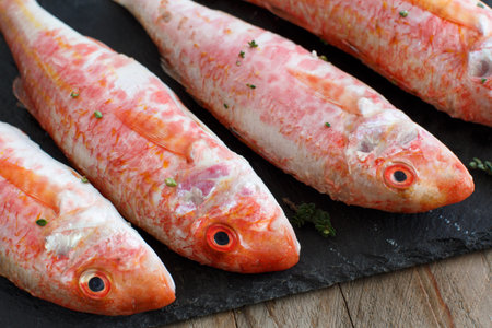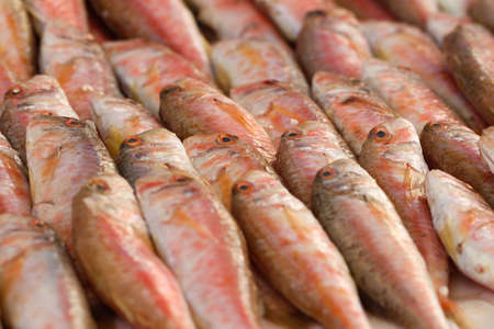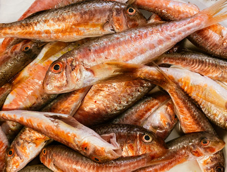 Fresh fish Red Mullet, top view, Barbel sea fish, Barbatus red fish