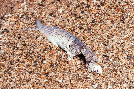 Decaying fish carcass lying on a sandy beach, partially buried in multicolored pebbles. Concept of environmental pollution, marine life, and natural decomposition. Selective focus.