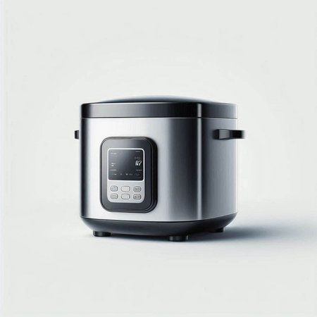 A sleek rice cooker with a modern design featuring a digital display and timer. Ideal for effortless cooking, this appliance enhances meal preparation at home.