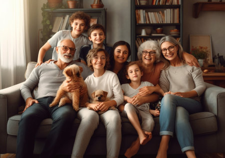 Generative AI : Big happy family Portrait of grandparents mother father and two their cute kids sister and brother sitting together on coach at home and smiling at camera Mortgage
