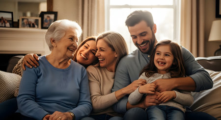 A happy multi-generational family, including a grandmother, parents, and a young daughter, sits together on a sofa in a living room. They are laughing and hugging, displaying strong family bonds and love.