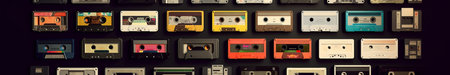 Vintage audio cassettes on a yellow background. 80s music on audio cassettes. Many audio tapes with old songs. Copy space