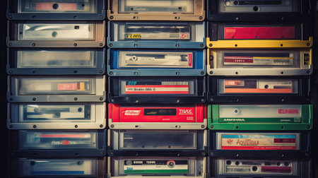 Various vintage audio and video media items are artistically arranged on a vibrant surface, showcasing nostalgia and creativity.