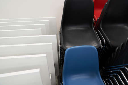 Black and blue plastic chairs are stacked next to folded iron stands. A lot of plastic chairs stand on top of each other against the background of the wall. High quality photo