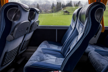 transport, tourism, road trip and equipment concept - travel bus interior and seats