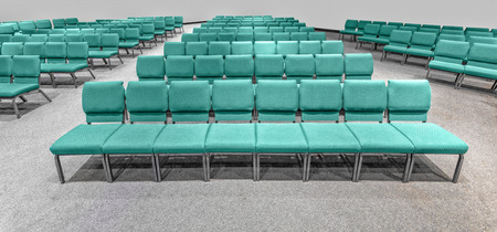 Rows of blue chairs in perspective, public interior, empty concert hall, top view